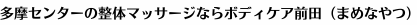 「大変楽になりました。ありがとうございました。 多摩センターに帰って来てくださっただけでも本当にありがたいです。」(八王子市 50代 女性) 「タマセンターに移転してくれて大変有り難いです。 私は、前田先生の整体の自然な癒し方を 以前から大変気に入っています。他の所と違うのは 嘘を言わないところです。 老若男女誰に対しても変わりません 娘も息子も先生のファンです。 これからも頑張って続けてくださいね。」(八王子市 40代 女性)